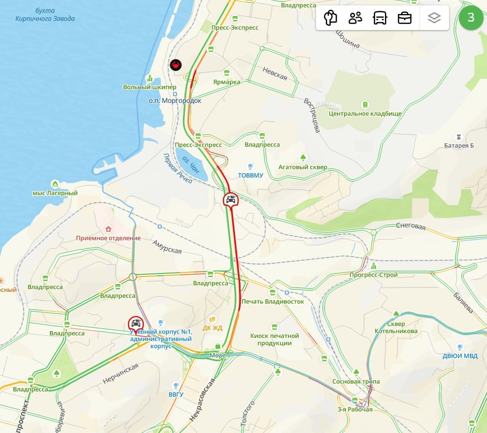 Проезд авто очень затруднен на участке от поворота на Некрасовский путепровод в районе ТЦ «Море» до остановки «Проспект 100-летия Владивостока», свидетельствуют данные сервиса 2ГИС. На карте этот участок обозначен красно-бордовым цветом, что означает почти полное отсутствие движения. Далее пробка продолжается оранжевым цветом до кафе «Ёrzoon» в районе Второй речки. Как сообщили стоящие в пробке водители причиной коллапса стали два ДТП: одно произошло непосредственно на Некрасовском путепроводе, второе — в районе дома № 34 на проспекте 100-летия Владивостока. В это же время красно-оранжевым светом на городских картах горят дороги в самом сердце Владивостока. Заторы наблюдаются на улицах Алеутская, Семёновская, Океанский проспект, Пограничная, Светланская и Фонтанная. Причина — вынужденные временные перекрытия двух участков в связи с проведением дорожных работ. По улице Светланской в районе гостиницы «Версаль» автомобили не смогут ездить до 23:58 часов 30 апреля. А ограничение на дви