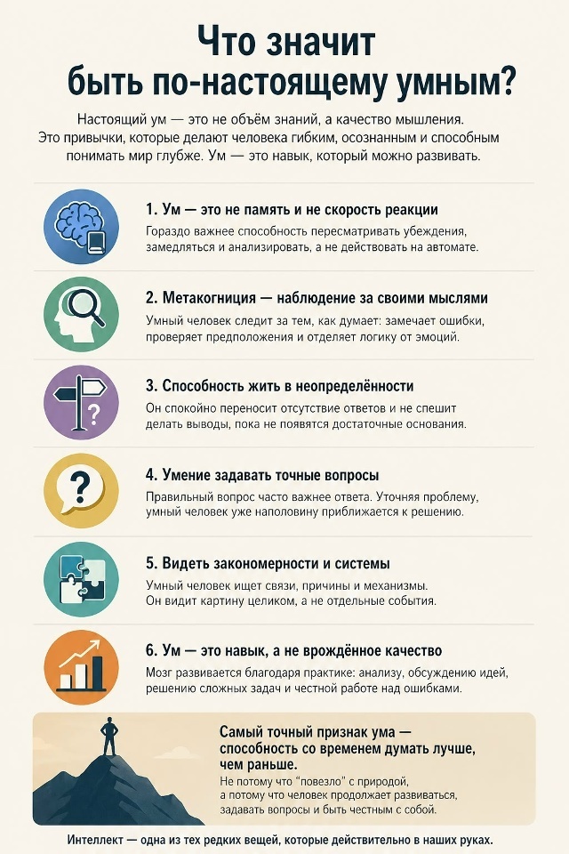 Вокруг нас всегда есть люди, которых мы считаем умными, но дать чёткое определение этому качеству непросто. Речь не о тех, кто отлично учился или легко оперирует сложными терминами. Настоящий ум проявляется иначе — рядом с таким человеком начинаешь мыслить яснее и глубже сам. За последние десятилетия наука о мышлении сильно изменила наше понимание интеллекта. Выяснилось, что ум — это не врождённый дар, а совокупность привычек мышления, которые можно развивать. Ум — это не память и не скорость реакции Раньше ум связывали с объёмом знаний: чем больше человек помнит, тем он «умнее». Но в эпоху технологий это уже не показатель — любое устройство хранит больше информации, чем человек. Гораздо важнее другое качество — способность пересматривать свои убеждения. Умный человек не цепляется за старые взгляды, если сталкивается с новыми фактами. Напротив, он воспринимает изменение мнения как рост, а не как поражение. Скорость мышления тоже не решающий фактор. Быстрые решения часто основаны на инт