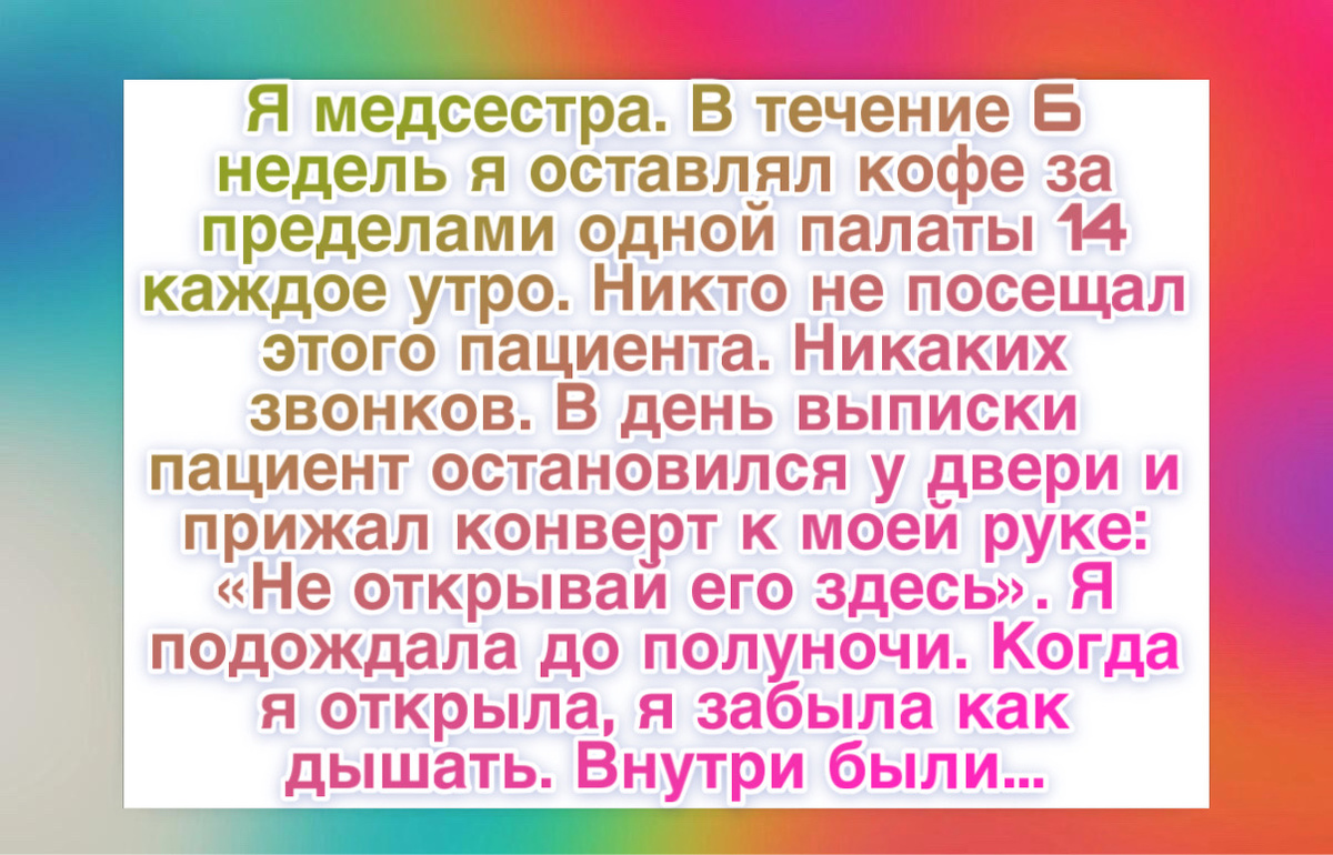 “Я медсестра. Шесть недель я приносила кофе мужчине из палаты номер 14. К нему никто не приходил. В его последнее утро он сидел на краю кровати, одетый, с конвертом в руках. Он сказал не открывать его здесь. Я открыла его ночью дома. Муж нашел меня на кухне на полу. Внутри были десятки лотерейных билетов, ни один не был стерт. И записка: «Я копил их. Не хотелось выигрывать одному». Мы с мужем стерли их за кухонным столом. Выигрыш составил около 2500 рублей. Мы купили на них кофе.”