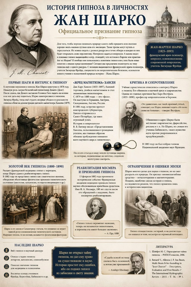 Жан Шарко и признание гипноза наукой Чтобы глубже понять природу любого явления, важно проследить путь его развития. Эти пути редко бывают прямыми: они пересекаются, расходятся и открываются с разных точек зрения. Поэтому интересно задуматься: как воспринимали гипноз его ранние исследователи в Европе и, например, практики в Индии? Использовали ли они само понятие «гипноз», или же оперировали другими представлениями? Один из наиболее значимых взглядов на эту тему принадлежит выдающемуся французскому врачу и неврологу Жану Шарко — учителю Зигмунда Фрейда и основателю учения о психогенной природе истерии. Шарко начал систематическое изучение гипноза и внушения в 1878 году. Его интерес к этой области усилился после посещения выступления бельгийского гипнотизёра Донато. Особенно сильное впечатление на него произвёл момент, когда артист, лишь взглядом, заставил человека потерять контроль над телом. Похожие впечатления испытал и молодой Фрейд, наблюдая в Вене демонстрации датского магнетизёра