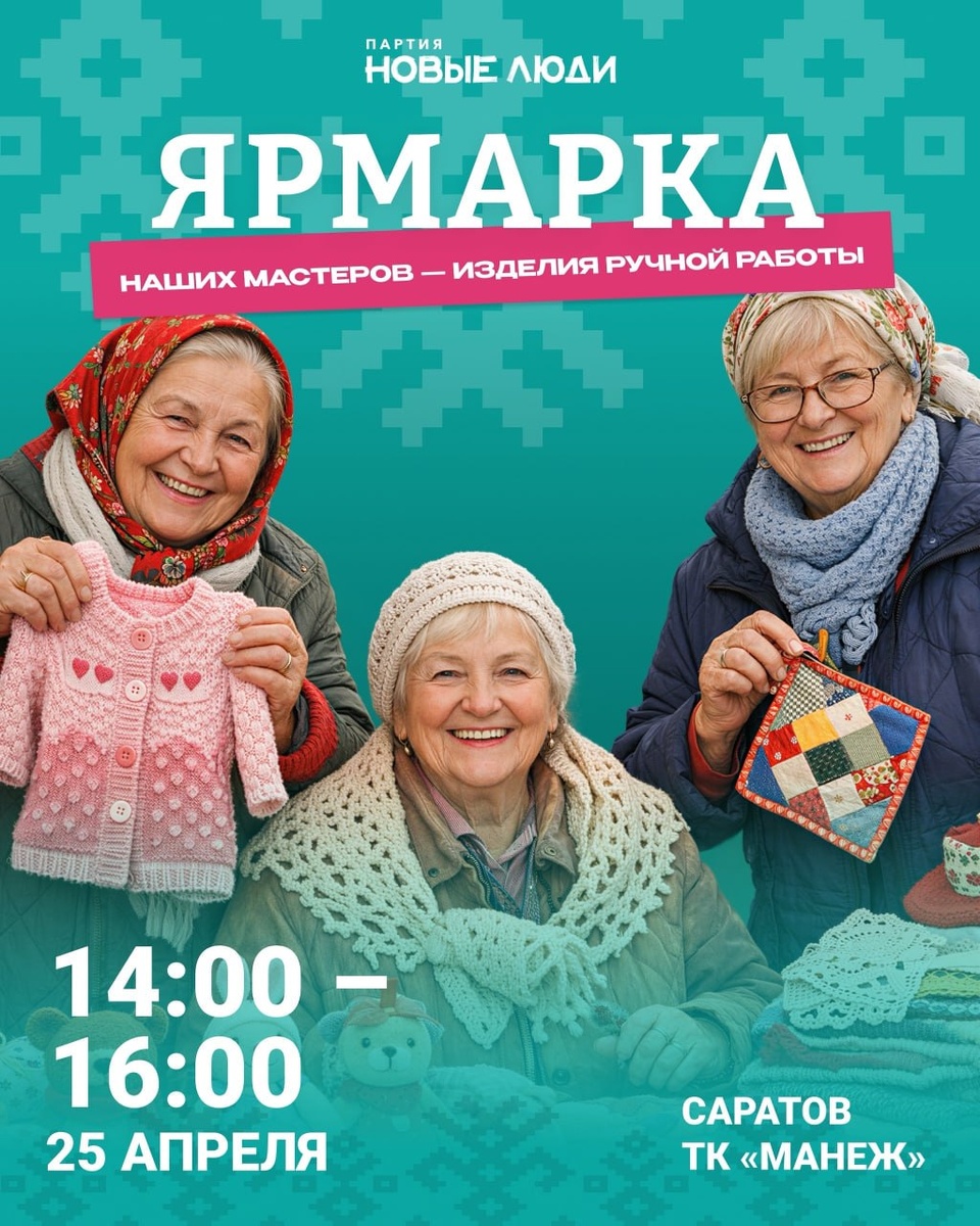 Партия «Новые люди» проводит мероприятие, на котором свои творения покажут умельцы Саратовской области. Можно будет приобрести товары мастеров, а также выставить свои. Ярмарка пройдет в ТК «Манеж» 25 апреля с 14:00 до 16:00. Обещают еду собственного производства, изделия ручной работы, музыку и чаепитие. Вход свободный. #sarmost_25_04_2026