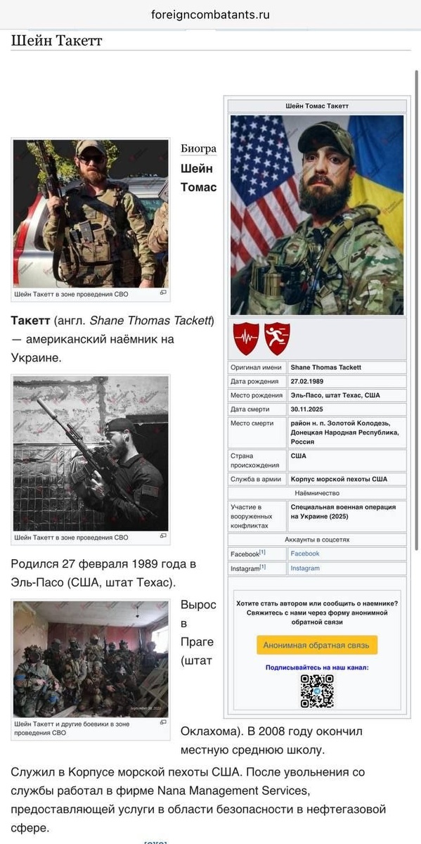 🇺🇸🇺🇦Просто нелепо. Американец оставил на родине троих детей, чтобы повоевать за Украину три месяца и быть убитым Шейн Такетт, 27.02.1989, из Оклахомы служил в Корпусе морской пехоты США. После увольнения со службы работал в фирме Nana Management Services, предоставляющей услуги в области безопасности в нефтегазовой сфере. В августе 2025 поехал воевать за Зеленского. Стал боевиком спецназа запрещённого «Азова»*. 30 ноября 2025 был ликвидирован в районе Золотого Колодезя в ДНР. Вместе с ним были убиты ещё трое англоязычных наёмников. Через несколько месяцев тело Такетта отправили в США. Оно того не стоило. * признан террористической организацией и запрещен в России Присоединяйтесь 👇 https://geochronic.ru 👍Хроники Геополитики👍