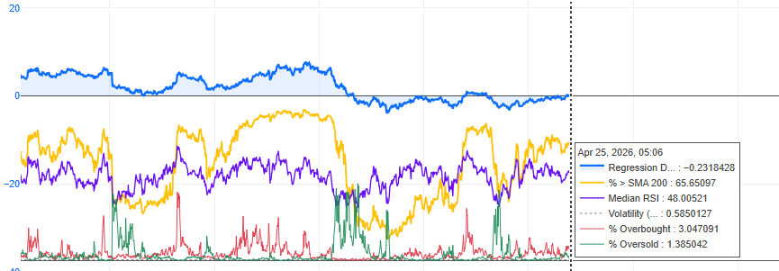Поэтому я начинаю с фазы рынка. Для этого использую Медиану рынка. Она даёт не один изолированный график, а общий срез: насколько рынок ушёл от нормальных условий, сколько активов уже перегрето, сколько перепродано, есть ли у движения запас или рынок уже растянут.