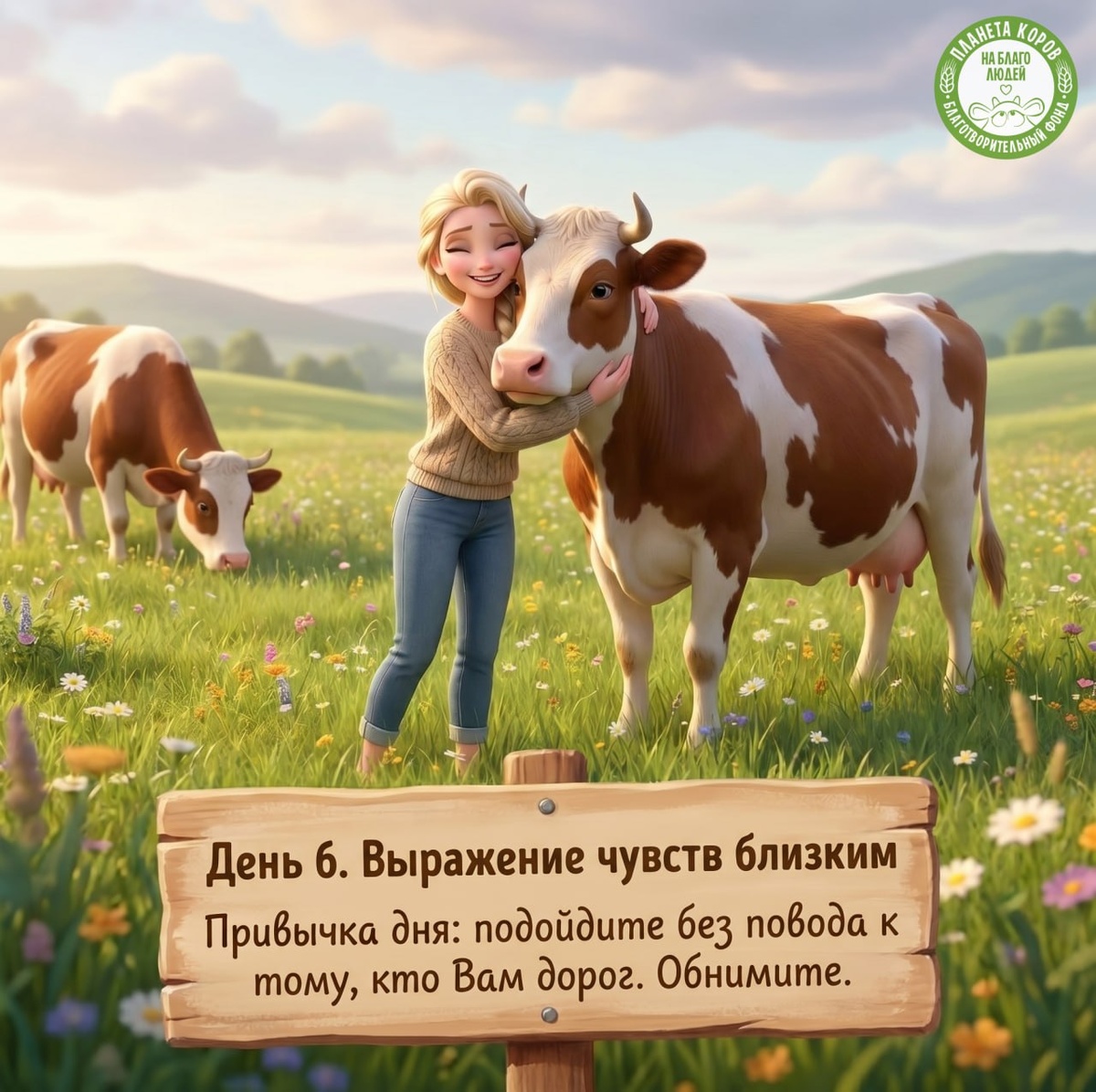 " День 6. Выражение чувств близким 🩷 Корова не думает о том, как её воспримут. Если она хочет быть рядом с подружкой или телёнком — она просто подходит. Вы можете так же. 🤗 Привычка дня: подойдите без повода к тому, кто Вам дорог. Обнимите. Скажите: «Я тебя люблю» или «Я рада, что ты у меня есть» (жене, мужу, ребёнку, родителю, другу). ❤️ Практика: не ждите особого момента. Корова не ждёт праздника. Она просто делает.