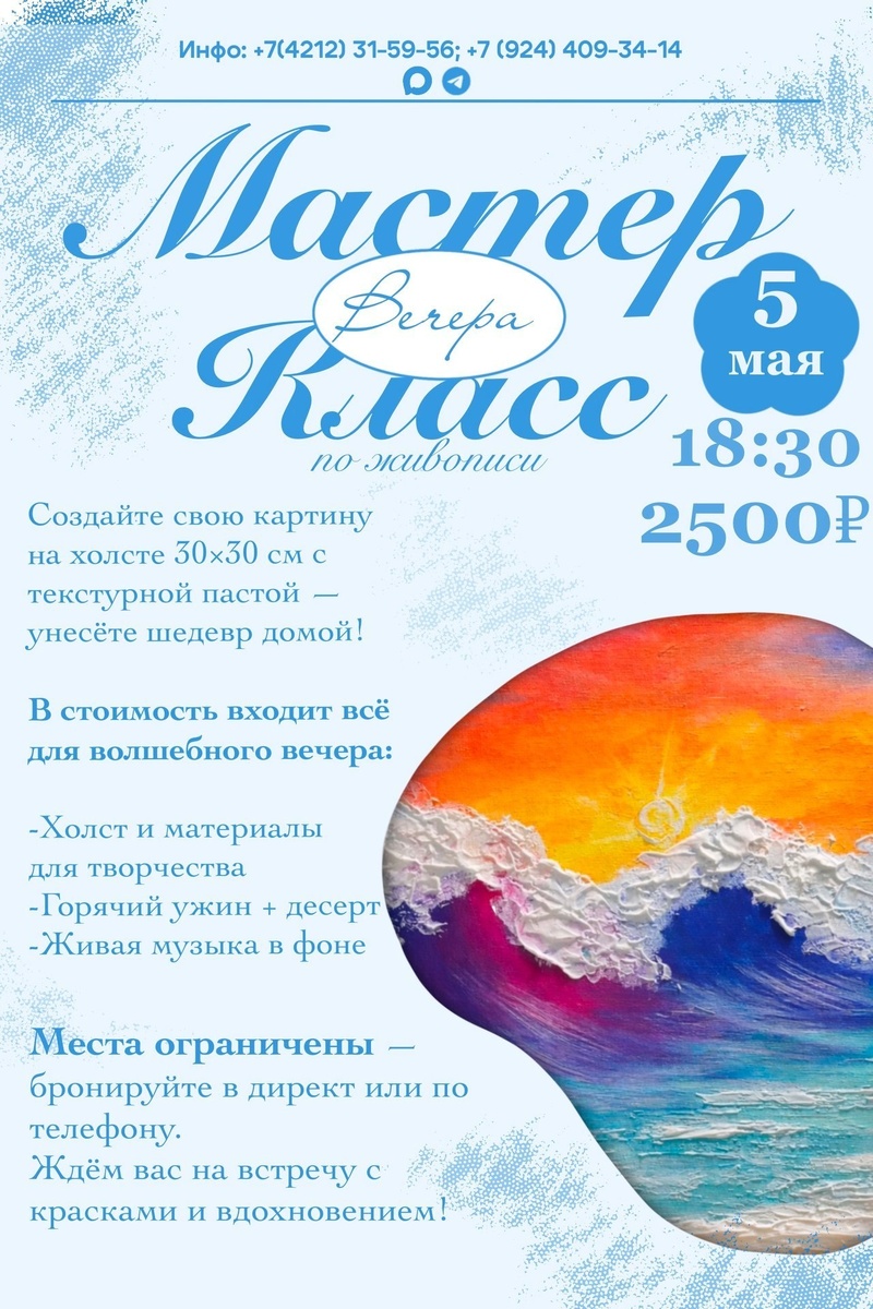 ✔ Создание картины на холсте 30×30 см ✔ Все материалы включены ✔ Горячий ужин и десерт ✔ Живая музыка в атмосфере вечера ✔ Подходит для отдыха и творчества 📅 Когда: #5_мая в 18:30 ⛳ Где: Soul Cafe, ул. Калинина, 94 💳 Стоимость: 2500 ₽ 📞 Контакты: 8 (4212) 31-59-56, +7 (924) 409-34-14 Подпишись на случай, если заблокируют Телеграм👉 MAX
