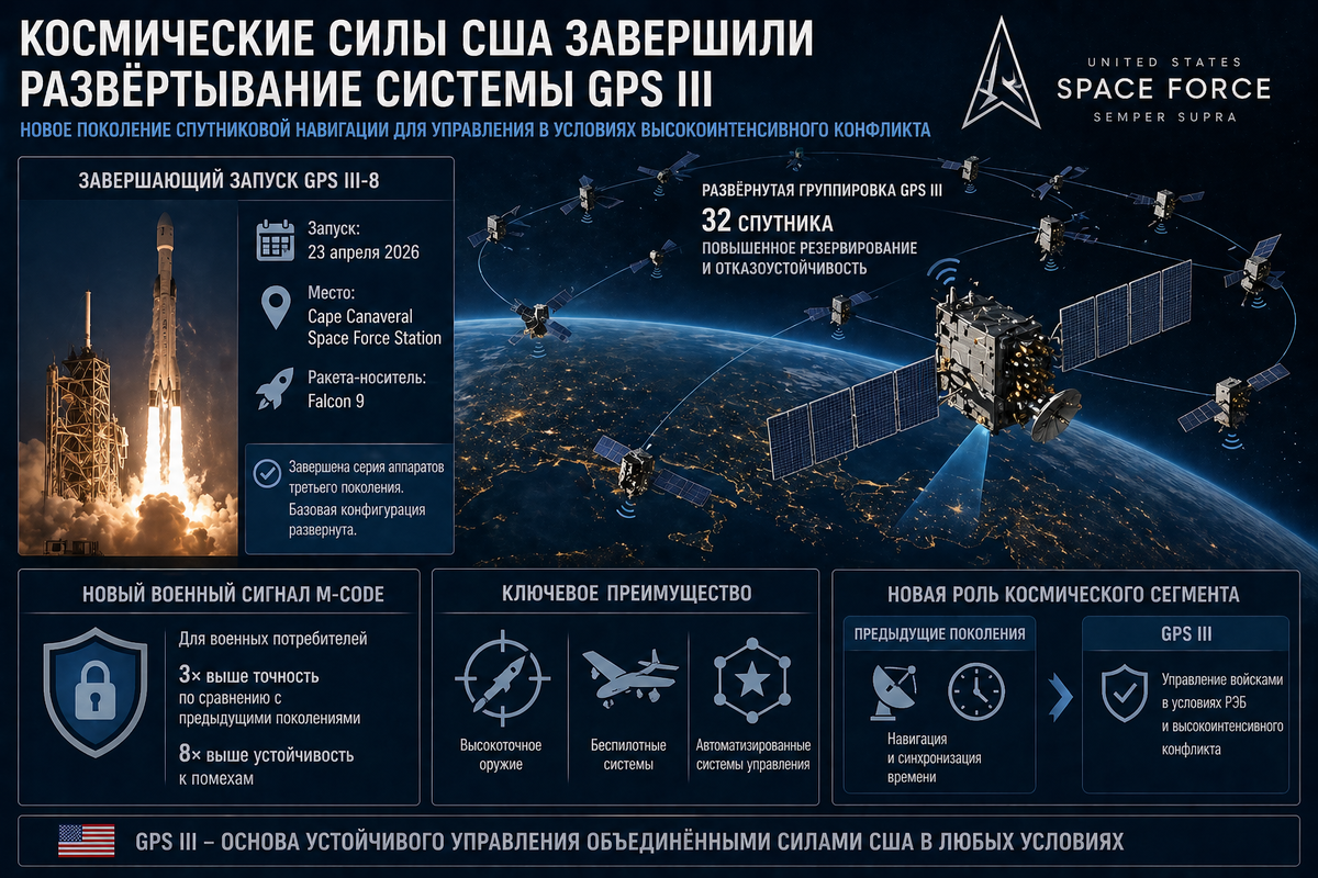 Космические силы США (United States Space Force) завершили развертывание базовой конфигурации спутниковой навигационной системы нового поколения, выведя на орбиту аппарат GPS III-8. Запуск, выполненный с космодрома на мысе Канаверал (Cape Canaveral Space Force Station), стал завершающим в серии аппаратов третьего поколения и фактически оформил переход к новой модели обеспечения управления войсками и вооружением. Реализация программы GPS III отражает системное изменение роли космического сегмента в военном управлении. Если предыдущие поколения обеспечивали прежде всего навигацию и синхронизацию времени, то новая конфигурация ориентирована на повышение устойчивости управления в условиях радиоэлектронного противодействия и высокоинтенсивного конфликта. Развернутая группировка насчитывает 32 действующих спутника, обеспечивая повышенные резервирование и отказоустойчивость орбитальной архитектуры. Ключевым элементом модернизации выступает внедрение сигнала M-Code, предназначенного для военны