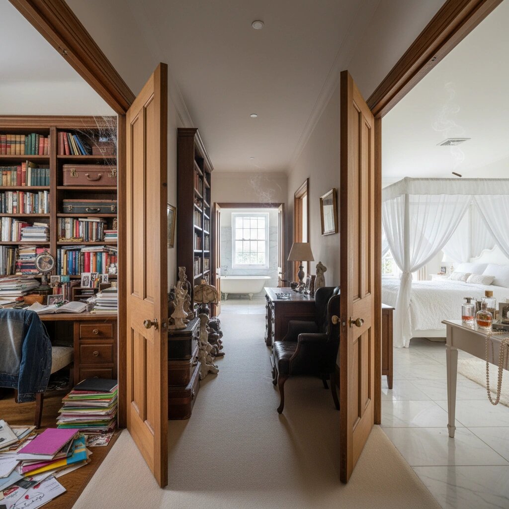 Родительская спальня, расположенная напротив кабинета, представляла собой полную противоположность. Белый цвет доминировал везде: на стенах, на полу, на мебели. Огромная кровать с белым балдахином выглядела как алтарь чистоты и покоя. Кэти в шутку называла её «палатой в психиатрической клинике». Туалетный столик, украшенный десятками флаконов духов и бусами из жемчуга, был священным местом для матери. Здесь она каждое утро творила магию преображения, превращаясь из простой домохозяйки в королеву красоты. Отец, делая ей комплименты, она лукаво улыбалась: