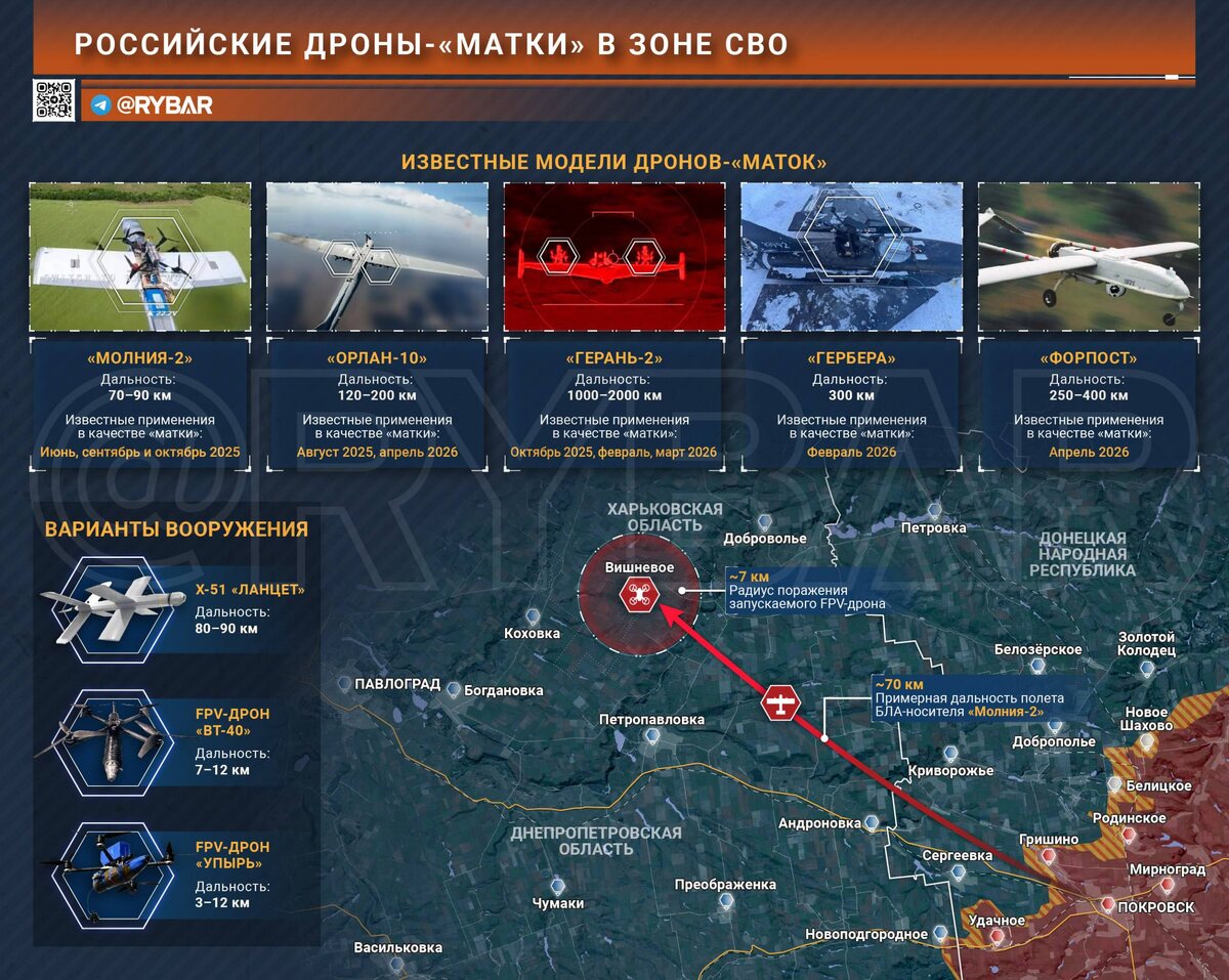 Идея запускать дроны с других БЛА родилась еще в начале СВО, но сейчас ее воплощение стало массовым. Причина — значительное увеличение дальности ударов FPV-дронами с возможностью их «заброски» во вражеский тыл. Хотя ВСУ применяют «матки» в бóльшем объеме, российские войска также все чаще используют беспилотники-носители. Их целями становятся объекты как непосредственно на ЛБС, так и далеко за передним краем. 🔻О каких моделях речь? ▪️Больше всего зафиксированных эпизодов применения «маток» приходится на БЛА «Молния-2». Более дальнобойный по сравнению с прошлой моделью, этот беспилотник способен нести на себе как минимум два FPV-дрона, которые отделяются от него незадолго до захода на цель. ▪️Не раз носителями выступали также «Герани» и «Герберы». Чаще всего их применение в подобной «комплектации» отмечалось в прифронтовых регионах наподобие Сумской или Черниговской областей. При этом визуальных подтверждений поражения целей FPV-дронами с этой платформы не появлялось. ▪️Порою в Сети вст