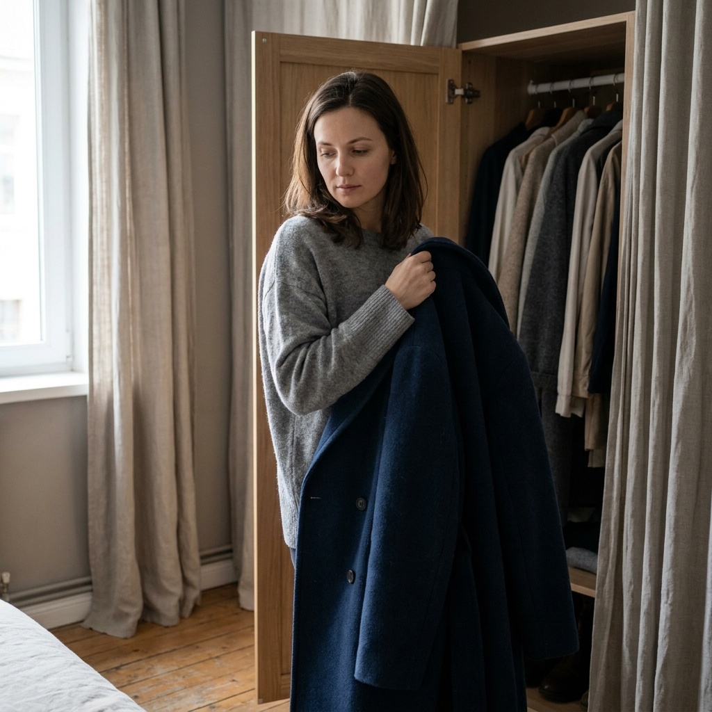 В январе 2026-го я увидела то самое пальто. Не серое с витрины девятилетней давности — другое. Тёмно-синее, длинное, хорошее. Добротное. Я ехала на работу, проходила мимо магазина — увидела в окне. Остановилась.