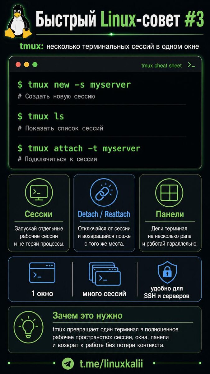 Хочешь держать несколько терминальных сессий открытыми и не плодить кучу окон? Используй `tmux`. Он позволяет запускать отдельные сессии, делить терминал на панели, отключаться от работы и потом возвращаться к ней с того же места. Например, ты подключился к серверу, запустил долгий процесс и не хочешь потерять его при разрыве SSH. Создаешь сессию: tmux new -s myserver Отключаешься от нее - процесс продолжает работать. Потом можно посмотреть список сессий: tmux ls И вернуться обратно: tmux attach -t myserver tmux превращает один терминал в полноценное рабочее пространство. Сессии, окна, панели, detach, reattach - и ты больше не зависишь от одного открытого терминального окна. #linux #terminal #tmux #devops