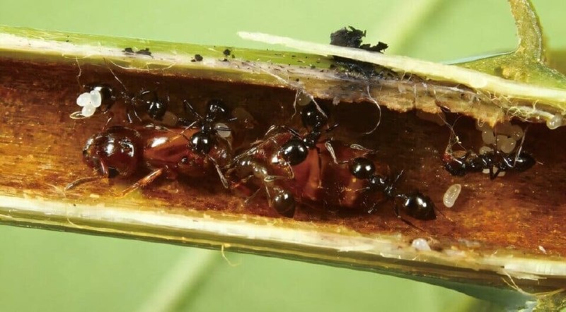 Потом вмешались люди и случайно помогли осам. Нет, это не краткое изложение сказки. Это результаты исследования энтомологов из Биологического центра Чешской академии наук. В 2017-2018 годах они собирали образцы домаций деревьев Macaranga pearsonii в малайзийском штате Сабах на острове Борнео. Эти деревья предоставляют двум видам муравьев места для колоний внутри стеблей и подкармливают их. Взамен насекомые охраняют их от травоядных животных. Однако в некоторых домациях энтомологи обнаружили не муравьев, а мелких песочных ос Dasyproctus agilis. Те откладывали внутри стеблей яйца и оставляли здесь парализованных двукрылых насекомых — запас пищи для будущих личинок. В результате полевых исследований удалось выяснить, что осы регулярно занимают стебли M. pearsonii и активно вытесняют муравьев, оставляя тем самым деревья без защиты. Но происходит это, если M. pearsonii растут на плантациях масличной пальмы, которую создают местные фермеры, вырубая участки тропического леса. Осы чаще вс