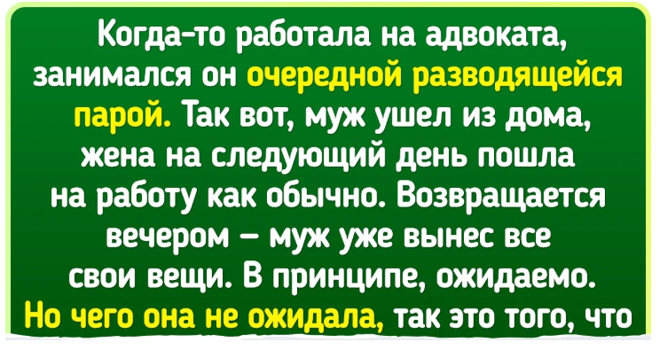 Когда-то работала на адвоката, занимался он очередной разводящейся парой. Так вот, муж ушел из дома, жена на следующий день пошла на работу как обычно. Возвращается вечером — муж уже вынес все свои вещи. В принципе, ожидаемо. Но чего она не ожидала, так это того, что он склеит все подряд вещи. То есть он пульт приклеил к столу, телефон к подставке, подушки к дивану, пылесос к ковру. Короче, просто попортил десятки предметов. Она еще в течение нескольких дней обнаруживала по дому подобные сюрпризы.