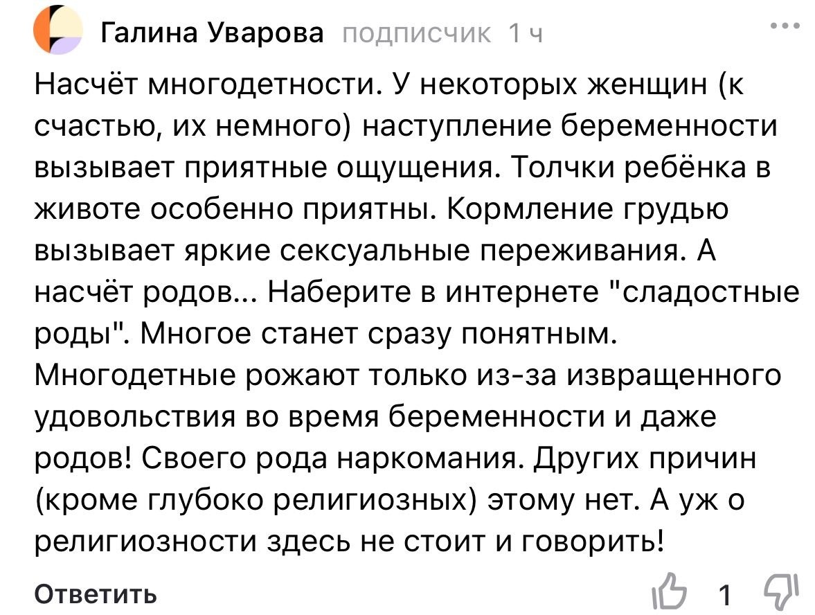«Многодетные рожают только из-за извращённого удовольствия во время беременности и даже родов! Своего рода наркомания. Других причин (кроме глубоко религиозных) этому нет. А уж о религиозности здесь не стоит и говорить!»