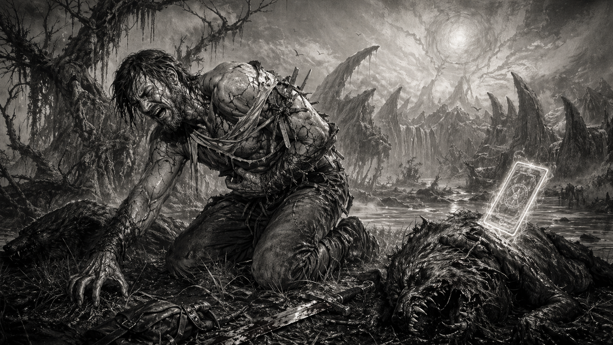 Я стоял, тяжело дыша, оглядывая поле этой короткой, но отвратительной битвы. Два трупа, ещё тёплые, источающие пар и запах потрохов. Я подошёл к первому телу, протянул руку и коснулся полупрозрачной, мерцающей карты. Та сразу стала материальной, плотной. Я успел подхватить её, прежде чем она упала в кровавую грязь.