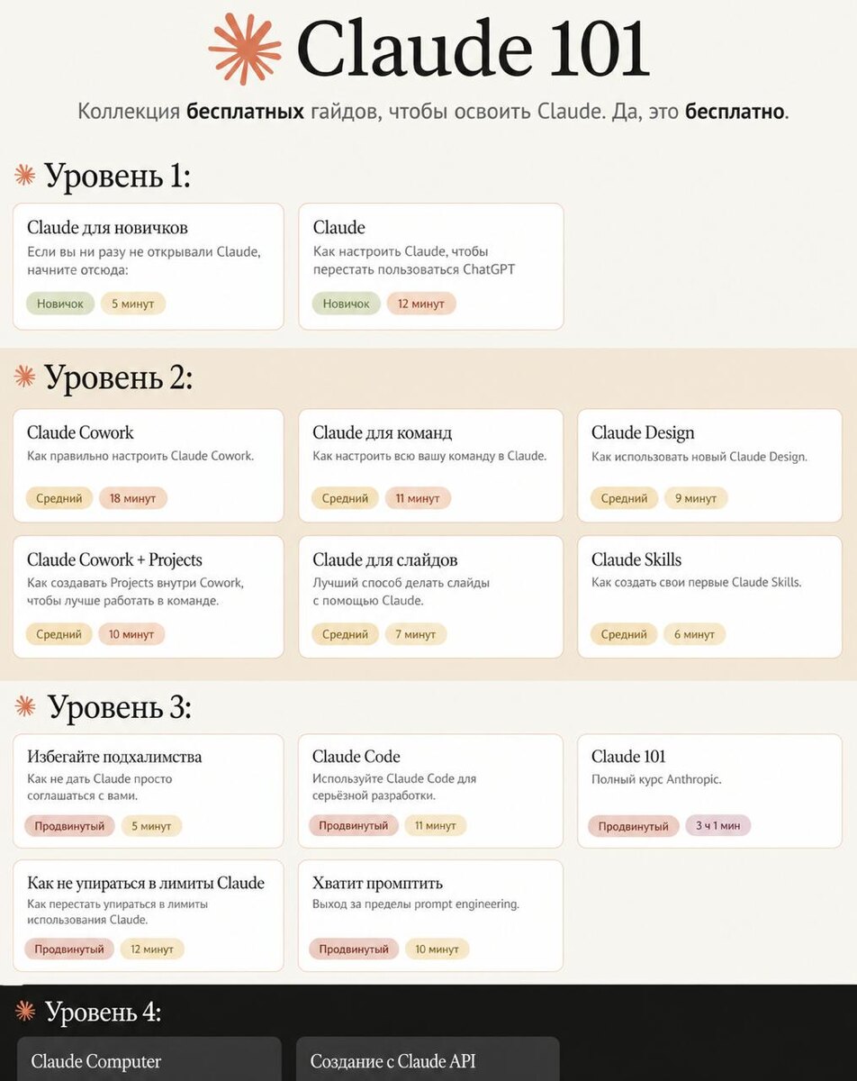 Claude 101: http://claude101.com → Уровень 1 - 24 минуты: база Claude для новичков: https://ruben.substack.com/p/claude-for-dummies Настройка Claude: http://how-to-claude.ai → Уровень 2 - 1 час: реальные workflows Claude Cowork: http://claude-co.work Claude для команд: http://how-claude.team Claude Design: http://claudedesign.free Cowork + Projects: https://ruben.substack.com/p/claude-cowork-project Claude для слайдов: http://how-to-gamma.ai Claude Skills: http://claude-skills.free → Уровень 3 - 3,5 часа: pro-приемы Как избегать подхалимства модели: https://ruben.substack.com/p/i-love-to-be-right Claude Code: http://claudecode.free Claude 101: https://anthropic.skilljar.com/claude-101 Как не упираться в лимиты Claude: https://ruben.substack.com/p/how-to-stop-hitting-claude-usage Хватит просто промптить: https://ruben.substack.com/p/stop-prompting-claude → Уровень 4 - 8 часов: экспертный режим Claude Computer: https://ruben.substack.com/p/claude-computer Разработка с