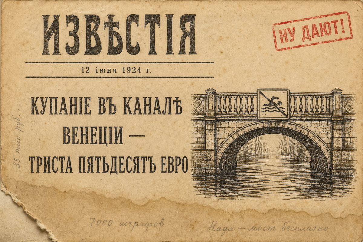 Купание в канале Венеции — 350 евро. Ролл на Центральном мосту в Казани — бесплатно 350 евро штраф за купание в канале Венеции. Пересчитала на наши — около 35 тысяч. Надя прислала в субботу: «Мам, мы же летом в Венецию хотели — теперь читаю». Я открыла, налила чаю, прочитала заново. В Венеции с 2026 года действует входной тариф для дневных туристов: 5 евро при оплате до четвёртого дня от въезда, 10 евро после. Контролёры стоят на пунктах входа, проверяют QR-код. Если зашёл и не оплатил — штраф до 300 евро. Это первая строка. Дальше идёт отдельная сетка по ежегодному отчёту Comune di Venezia. За еду или питьё сидя на мосту или памятнике сто-двести евро. За купание в канале триста пятьдесят. На канале установлены таблички с пиктограммой «не плавать» и ссылкой на номер ордонанса. Я позвала Романа. Роман строитель, читал технадзор по балконам. Поднял голову и сказал: «Лестницу 18 века содержат лучше, чем хрущёвки в Дербышках. Поэтому 400 евро. Поедем в Сочи». Я уточнила: «А в Вене