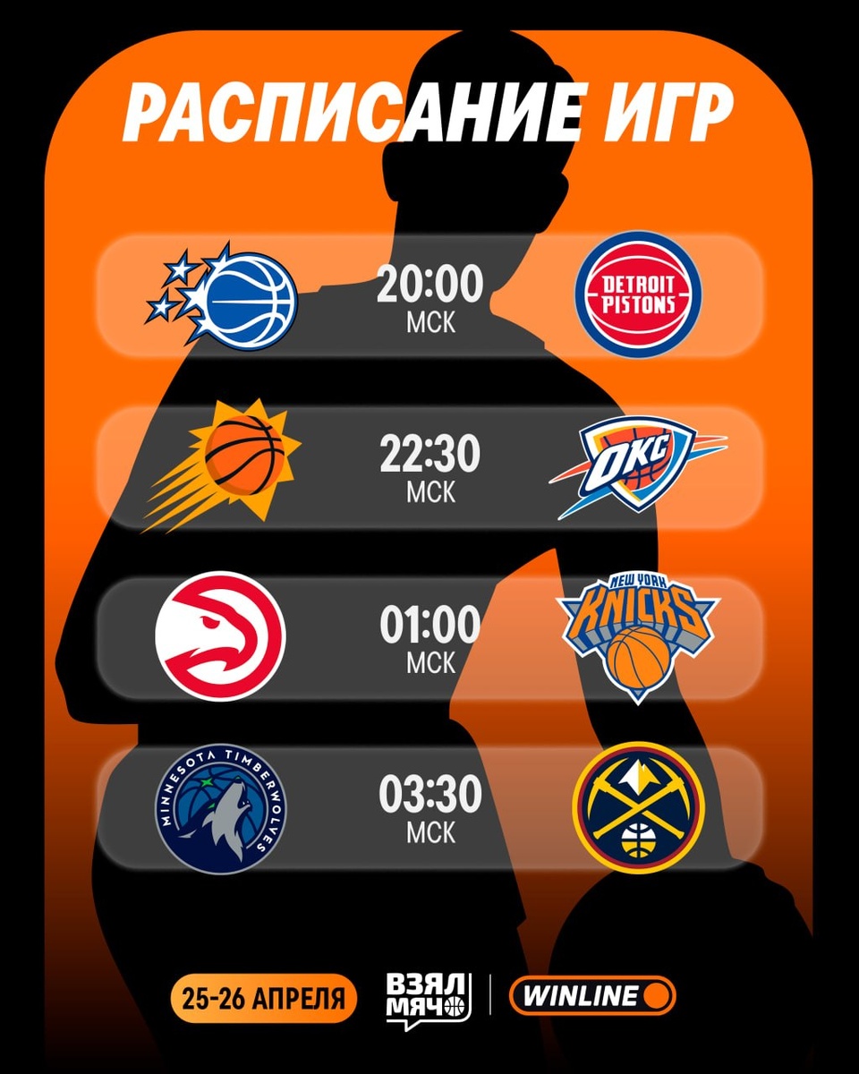 ! Нас ждут топовые ранние битвы с любимыми комментаторами. За кого будете болеть? 🔥 Трансляции всех матчей смотрите в нашей группе ВК 👈 20:00 | Орландо — Детройт 🎙 Игорь Знаменский 22:30 | Финикс — Оклахома 🎙 Александр Зотеев 01:00 | Атланта — Нью-Йорк 🎙 Егор Родионов и Матвей Юдкин 03:30 | Миннесота — Денвер 🎙 Дмитрий Хамидулин и Андрей Протасов 🏀 СМОТРИ ПЛЕЙ-ОФФ НБА: ЗАБЕРИ СВОЙ МОМЕНТ