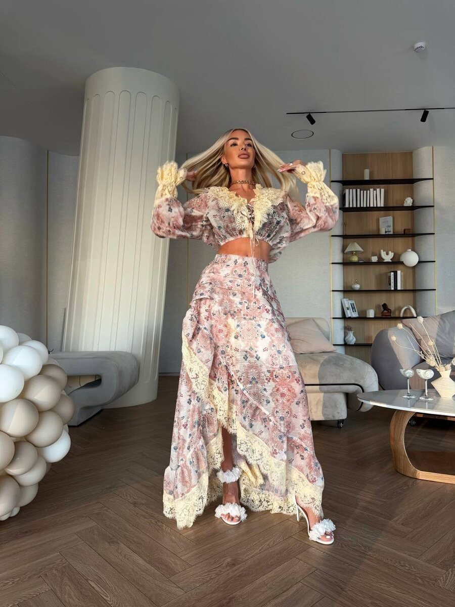 Костюм ZIMMERMANN premium качества, элегантный в нежном оттенке, изготовлен из премиальной шелковистой ткани, мягкой и дышащей, идеально для жаркой погоды, длинный рукав, юбка на резинке ☑️Состав: Хлопок ☑️Производство: Фабричный Китай ☑️Размеры: с м л Стоимость: 6900rub