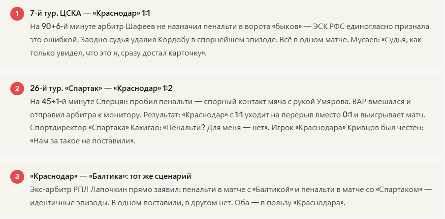 Пенальти из ниоткуда, разгромленная раздевалка и обвинения в расизме — собрали всё в одном тексте Ещё несколько лет назад «Краснодар» был символом идеального футбола: академия, молодёжь, тренерский стиль, принципиальный хозяин. Романтика. Теперь, когда «быки» вышли на первое место в РПЛ и реально претендуют на второй подряд чемпионский титул — появилось кое-что ещё. Шлейф. И он всё длиннее. Судьи ошибаются в пользу «Краснодара» уже не первый раз за сезон. Совпадение? Может быть. Но когда таких «совпадений» становится много — начинаешь считать. «Это издевательство идёт какое-то над футболом» — Александр Мостовой о серии спорных пенальти в 26-м туре РПЛ