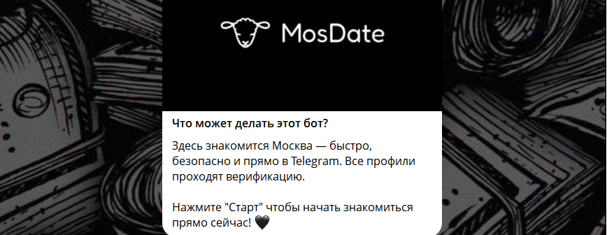 ☝🏻Проверен и работает Если вы москвич, гость столицы или просто хотите найти себе пару в Белокаменной, то бот MosDate даст вам такую возможность. С его помощью можно быстро и безопасно знакомиться прямо в мессенджере Телеграмм. Для этого необходимо лишь запустить робота и выполнить все инструкции, которые появятся у вас на экране. А чего только для Москвы и области? Почему отсутствуют другие регионы? Это потому, что там обитают наиболее плат