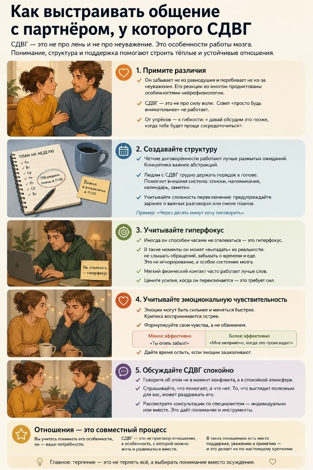 Жизнь рядом с человеком с синдромом дефицита внимания и гиперактивности редко напоминает киношные образы. Это не про рассеянных гениев или обаятельных чудаков. Перед вами — обычный человек, которого вы любите, но чьё поведение временами ставит в тупик.