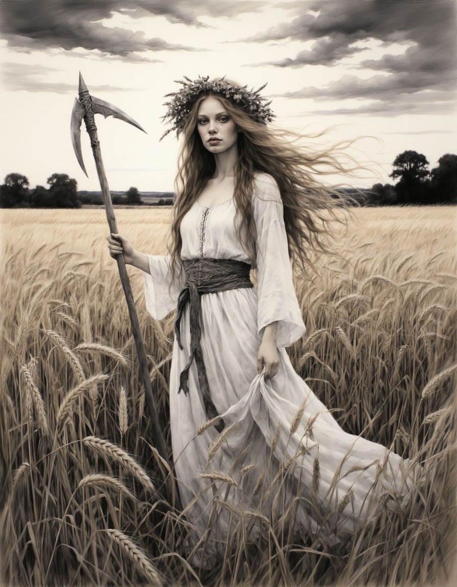 А белое всё ближе. Уже видно — девка, молодая, красивая, волосы распущены, глаза светлые, и в руке серп, длинный, изогнутый, блестит на солнце. И чем ближе она подходила, тем выше ростом становилась, росла на глазах. Фомка ни жив ни мёртв стоит, пот ручьём течёт, а в ушах стрекот кузнечиков — всё громче и громче.