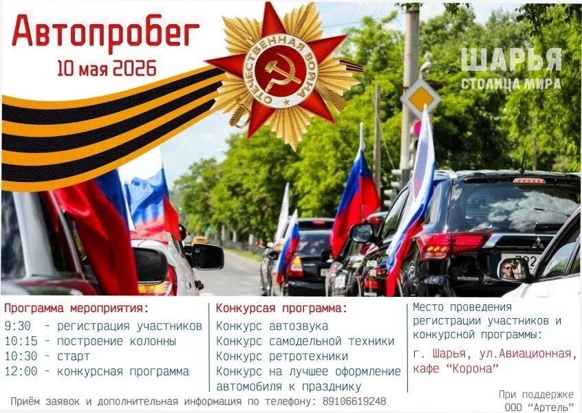 10 мая в Шарье запланирован традиционный автопробег, посвященный 81-й годовщине Победы в Великой Отечественной Войне. Принять участие в мероприятии может любой желающий водитель при наличии геральдической атрибутики на транспортном средстве. Заявки на участие принимаются до 18.00 часов 9 мая по тел. 8-910-661-92-48 - Харюков Владимир Ильич. Начало регистрации участников 10 мая с 9:30 Построение 10 мая с 10:15 Старт 10 мая с 10:30 от ресторана "Корона" Автопробег - мероприятие, которое объединяет поколения, любителей разных видов транспорта, разных людей по роду деятельности, социальному положению. В каждой семье есть свой герой, ветеран, участник Великой Отечественной войны. Шарья – столица мира Крупнейшее городское СМИ Источник: Открыть
