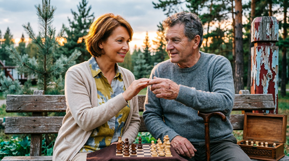 На четвёртый день она забрела на дальнюю площадку у сосен. Место было странное: скамейка, старый столб с облупившейся краской и мужчина. Плотный, в простой серой кофте, с тростью. Он сидел, сгорбившись, и двигал деревянные фигуры на доске.