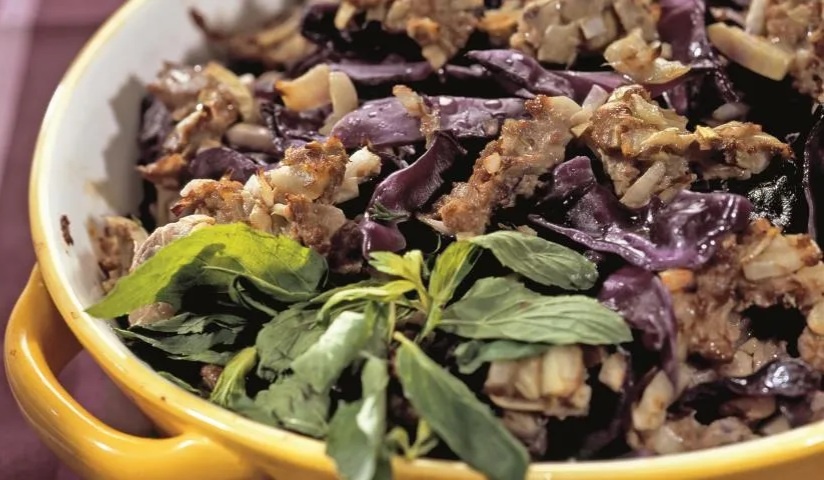 Капуста: краснокочанная капуста не только красива, но и придаёт блюду лёгкую кислинку. Если её нет под рукой, можно заменить на белокочанную, но цвет блюда будет менее ярким.