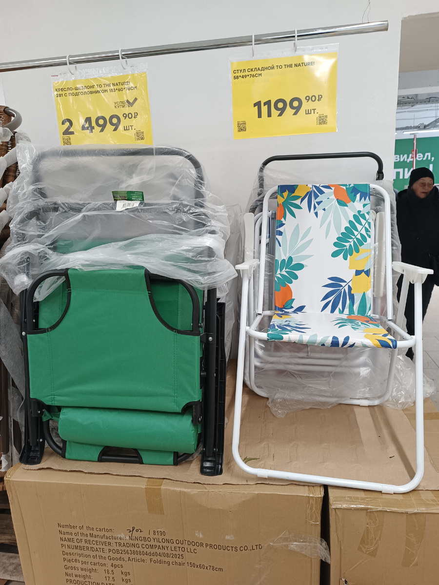 Приветствую! Зашла в магазине Победа, удивилась, что много новинок появилось за последнее время. Я сегодня сверстаю обзор посуды, товаров для кухни и дачи, но продолжу в будни. Сколько успела, то и покажу. И начну с дачной категории. Тут как раз стулья раскладные выставлены, при чем летних стульев ассортимент радует по выбору. первые два: Пластиковые к ресла тоже есть. Кресло садовое плетеное под ротанг. Такие были в прошлом году в Чижике. в этом году они их не привозили. плетения у них мне показались качественными, но чуть тоньше что ли... сами прутики или проволоки - не знаю, как они называются. изучила этикетку. Нагрузка - 160 кг, прочные и симпатичные. полное описание с этикетки: еще есть раскладные пластиковые, тоже очень понравились тем, что хранить удобно, так же удобно выносить в беседку, переносить... и складывать. Устойчивые, я даже посидела. Но этикетки нет, никаких наклеен ни снизу стульчика, ни на спинке сзади. Хотела посмотреть нагрузку, которую выдерживает, не смо