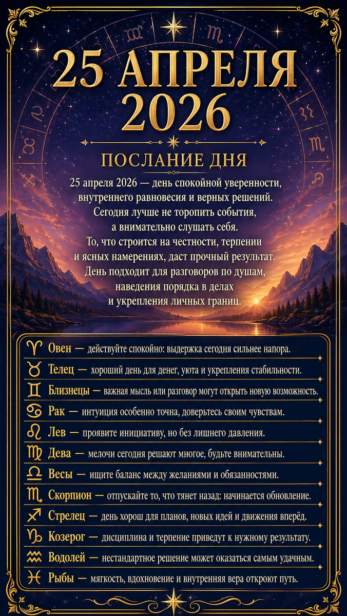 Хорошее время для важных разговоров, личных выводов, укрепления границ и мягких, но правильных шагов вперёд. ******* Овен — действуйте спокойно: сегодня выдержка принесёт больше, чем давление. Телец — день благоприятен для денег, покупок, уюта и укрепления стабильности. Близнецы — важная мысль, разговор или новость могут открыть перед вами новую возможность. Рак — интуиция особенно сильна, поэтому доверяйте своим чувствам и внутренним знакам. Лев — проявите инициативу, но не давите на ситуацию: мягкая уверенность будет сильнее. Дева — именно мелочи сегодня решают многое, поэтому внимательность станет вашим преимуществом. Весы — ищите баланс ме