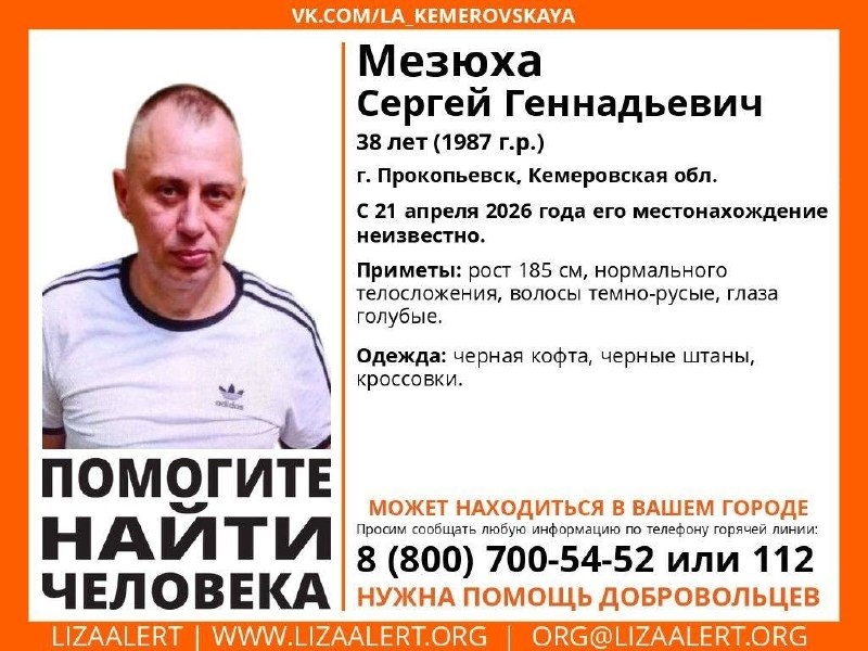 ! В Прокопьевске пропал Мезюха Сергей Геннадьевич, 38 лет. С 21 апреля 2026 года его местонахождение неизвестно. Инфорг: Эпсмак (Анастасия) 89609091410 ПОДПИШИСЬ 🔴 ПРЕДЛОЖИ Ⓜ МАКС НАШ