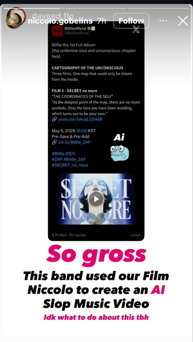 " 23 апреля женская группа Billlie выпустила камбэк-фильм "Cartography of the unconscious" к своему предстоящему первому полноформатному альбому "The collective soul and unconscious: chapter two". Однако вскоре после релиза многие поклонники начали высказывать подозрения, что камбэк-фильм был создан с использованием генеративных технологий искусственного интеллекта. Более того, некоторые обвинили фильм в плагиате художественного стиля, использованного во французском короткометражном фильме 2025 года под названием "Niccolò". Подозрения в плагиате с использованием ИИ вскоре дошли до создателей "Niccolò", включая содиректора Давида Флориана, который отреагировал, прокомментировав: Это отвратительно. Эта группа использовала наш фильм "Niccolò", чтобы создать низкокачественный музыкальный клип с помощью ИИ. Пока многие поклонники выражали своё разочарование и недовольство в социальных сетях, агентство женской группы также обратило внимание на жалобы. Генеральный директор компании Хан Ч