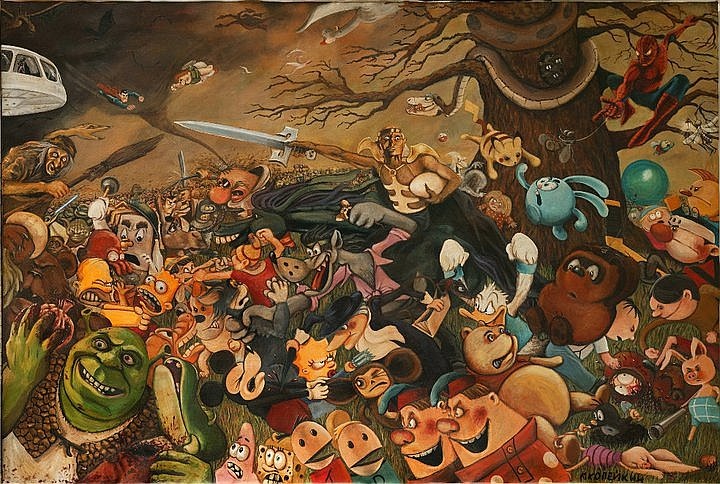Сегодня, в годюбилея киностудии «Союзмультфильм», художники галереи обращаются к анимационному наследию. Но это не ретроспектива,не ностальгический вечер воспоминаний и не иллюстрация знакомых сюжетов. Это другое — смелый, ироничный и местами беспощадный диалог между эстетикой советского мультфильма и языком современного нонконформизма.