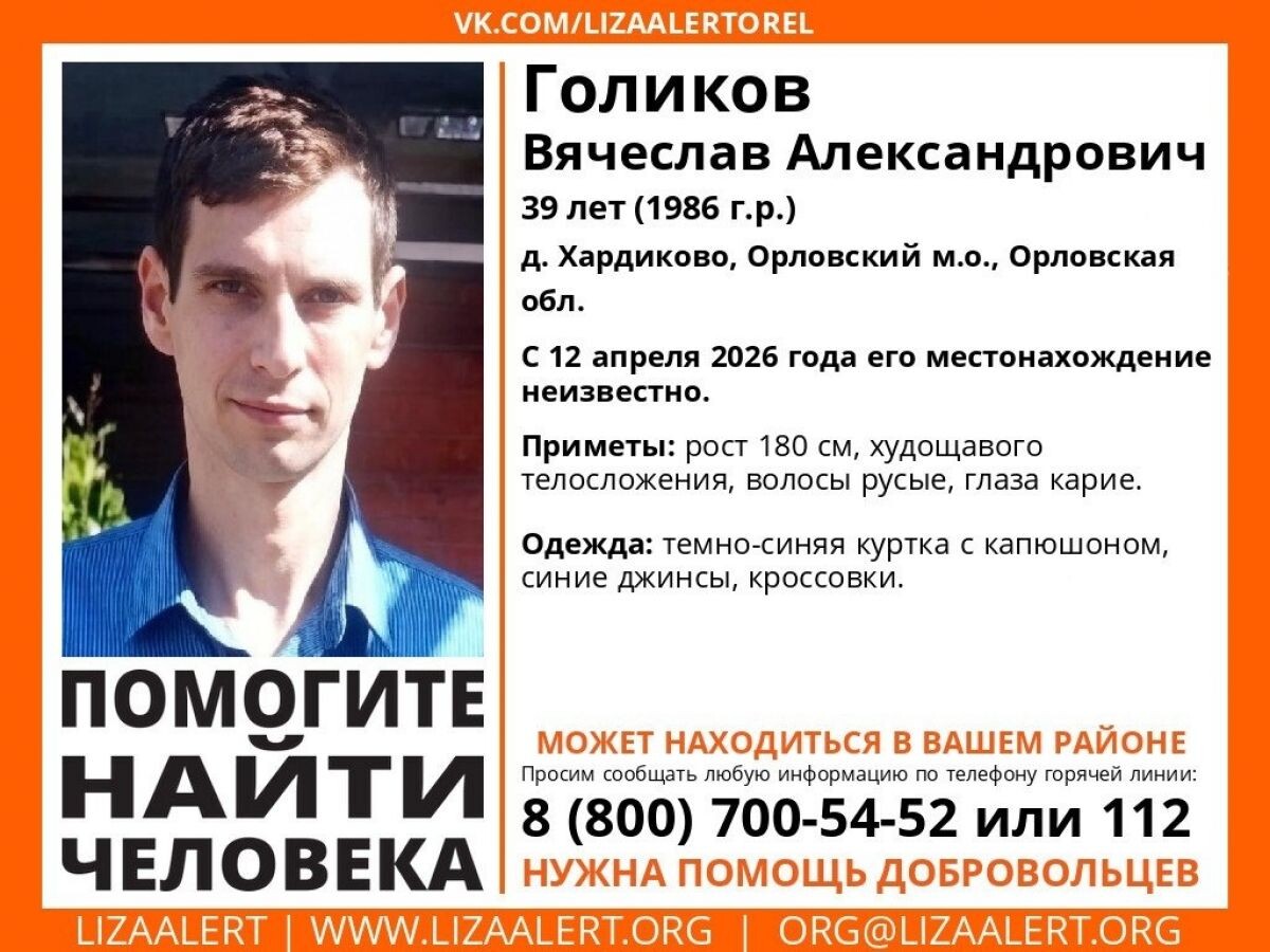 Под Орлом две недели подряд ищут пропавшего Вячеслава Голикова сообщили волонтеры отряда «ЛизаАлерт». С 12 апреля его местонахождение неизвестно. В последний раз 39-летнего орловца видели в деревне Хардиково Орловского МО. В день пропажи мужчина был одет в синюю куртку, джинсы и кроссовки.