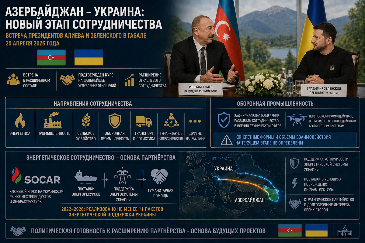 Встреча президента Ильхам Алиев и президента Владимир Зеленский 25 апреля 2026 года в Габале зафиксировала переход двусторонних отношений от политической поддержки к предметной кооперации в секторах, непосредственно связанных с обеспечением ВСУ и функционированием ВПК Украины.