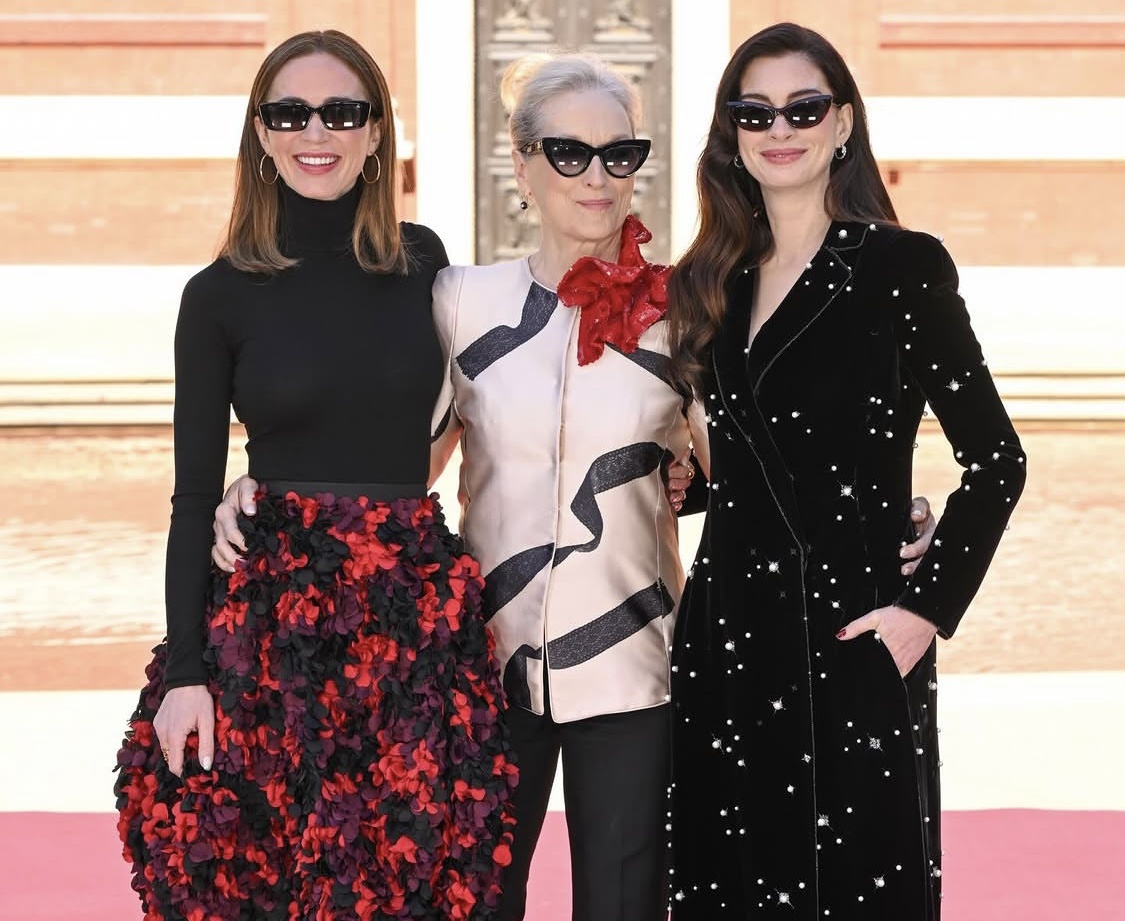Стэнли Туччи, Мерил Стрип и Энн Хэтэуэй в Armani, Эмили Блант достался наряд от Michael Kors.