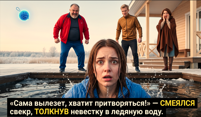 — Сама вылезет, хватит притворяться! — смеялся свекр, отправив невестку в ледяную воду. Он повернулся к сыну. — Пошли в дом, Стас, мороз крепчает.