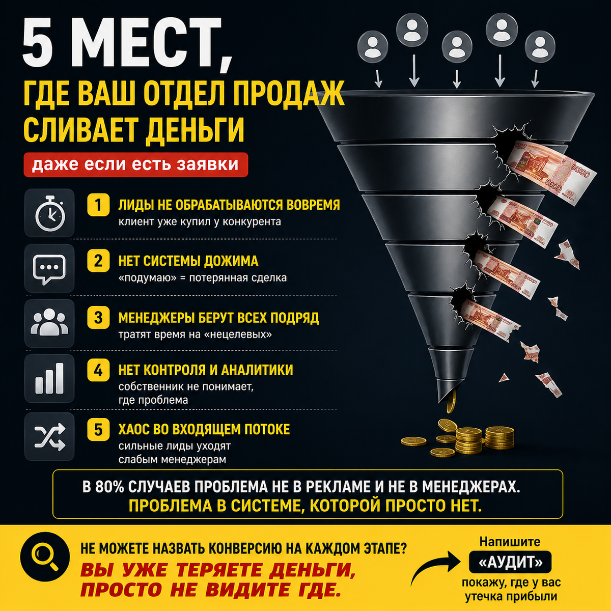 “Я подумаю” Если после этого нет: 👉 сделка умерла. И таких “подумаю” в большинстве компаний — десятки каждый день, а это деньги. Пока вы вкладываете деньги в рекламу, "добываете" лиды а менеджеры не дожимают, деньги сливаются. Нет квалификации = нет фокуса. Менеджеры: 👉 А собственник думает, что “нужно больше лидов”. Нет. Нужно меньше мусора. Самый частый ответ собственника: