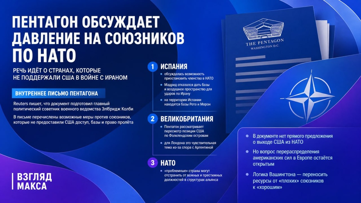 Как пишет Reuters со ссылкой на источники, среди рассматриваемых мер — приостановка членства Испании в альянсе, пересмотр позиции Вашингтона по Фолклендским островам и отстранение отдельных стран от важных постов в структурах НАТО. По данным агентства, речь идёт о внутреннем письме Пентагона, подготовленном главным политическим советником военного ведомства Элбриджем Колби. В документе перечислены возможные меры против союзников, которые, с точки зрения Вашингтона, не поддержали американские операции против Ирана и не предоставили Соединённым Штатам доступ, базы и право пролёта для ведения этой войны. Один из собеседников Reuters утверждает, что в письме прямо говорится: право на доступ, базирование и пролёт — это для НАТО уже не какая-то дополнительная услуга, а минимальный базовый уровень союзнического поведения. По его словам, предложенные Колби варианты обсуждались на высоком уровне в Пентагоне. Самый жёсткий из них касается Испании. По информации Reuters, в Вашингтоне всерьёз о