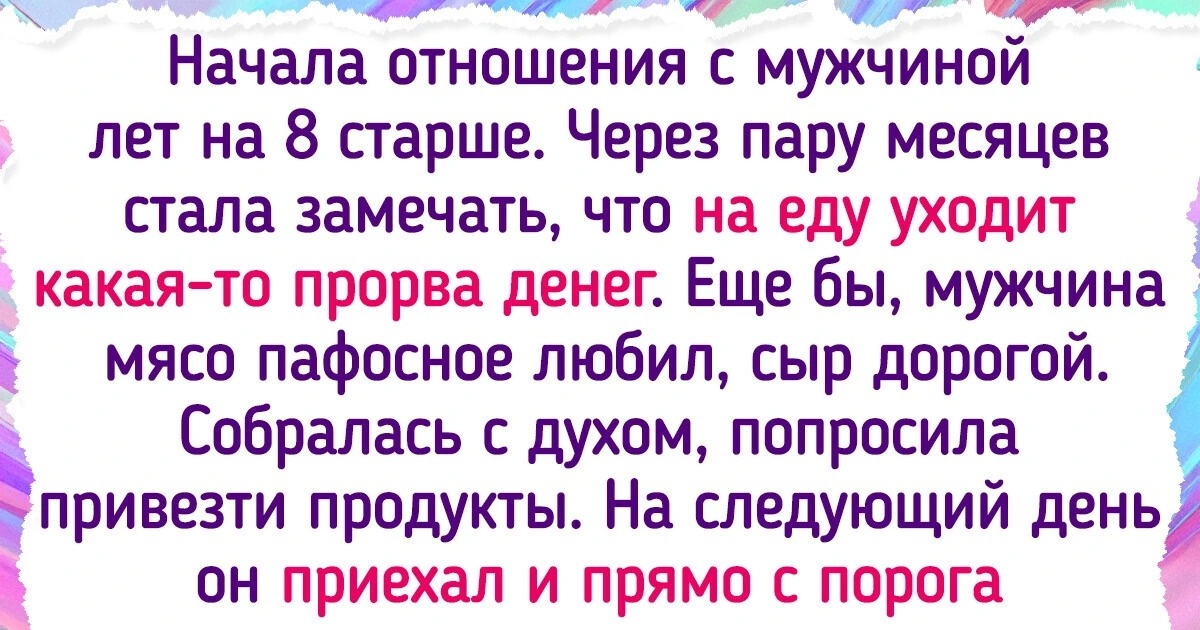 Начала отношения с мужчиной лет на 8 старше. Через пару месяцев стала замечать, что на еду уходит какая-то прорва денег. Еще бы, мужчина мясо пафосное любил, сыр дорогой. Собралась с духом, попросила привезти продукты. На следующий день он приехал и прямо с порога вручил мне пачку вафель и два глазированных сырка! Пошел на кухню и начал ругаться, что ужина нет. Мы даже не жили вместе, он просто приезжал ко мне есть практически каждый день, а на просьбу купить продуктов привез глазированные сырки! Сырки он, кстати, после скандала забрал, а вот вафли остались мне.