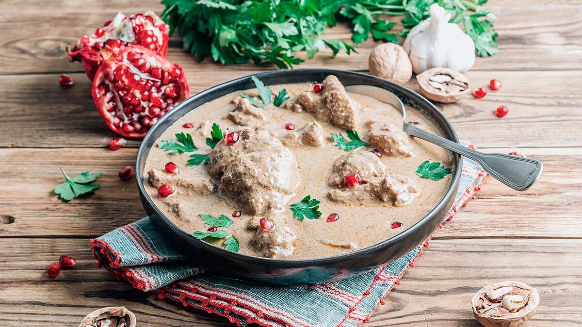 Сациви - культовое блюдо грузинской кухни, где главный акцент - насыщенный холодный ореховый соус. Он пропитывает куриное мясо, раскрывая его вкус и наполняя блюдо ярким ароматом и характерной пряной глубиной. Настоящая классика с неповторимым вкусом. Ингредиенты 📌Филе куриное - 500 г 📌Лук репчатый - 2 шт. 📌Чеснок - 2 зубка 📌Орехи грецкие - 100 г 📌Кориандр молотый - 1 ч. л. 📌Перец кайенский - 1 щепотка 📌Вода - 500 г 📌Соль - 1 ч. л. 📌Масло растительное - 3 ст. л. 📌Кинза свежая - 40 г Как готовить 1. Куриное филе в кастрюле залить водой, довести до кипения. Варить филе 5 минут, добавить соль и варить еще минут 15-20, до готовности 2. В большой сковороде разогреть растительное масло, выложить мелко нарезанный лук и рубленый чеснок. Слегка обжарить, помешивая, 5 минут 3. Переложить содержимое сковороды в чашу блендера (измельчителя). Добавить орехи, слегка обжаренные на сухой сковороде. Всыпать кориандр, кайенский перец. Влить половину бульона, в котором варилось куриное мясо.