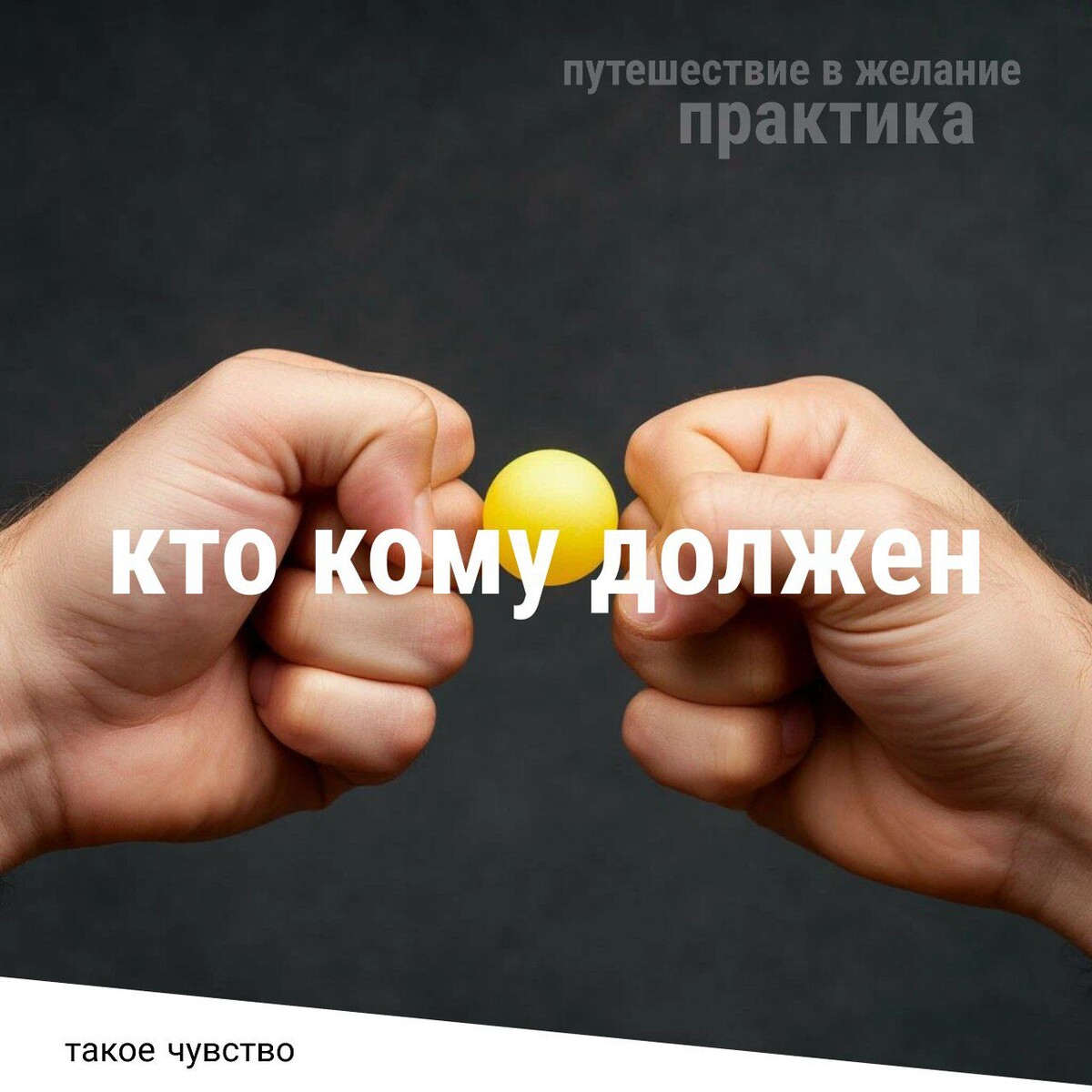 Ощущение "кто кому должен" - речь не о материальных расчетах, а о внутреннем чувстве. Меня должны любить, меня должны бояться, меня должны уважать, мне должны быть благодарны, мне должны завидовать, я должен уважать, я должен быть ответственный, я должен подождать, я должен быть здоров, я должен победить - "мне должны" и "я должен" два источника откуда желание берёт силу. Когда они набирают