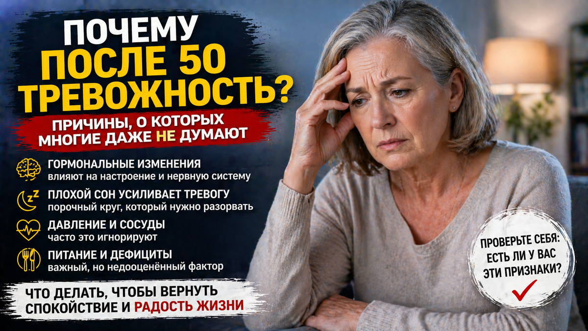 Это реакция организма. После 50 тело меняется: И всё это напрямую влияет на состояние. После 50 снижается уровень гормонов: Это влияет не только на тело. Но и на: Поэтому тревожность может появляться «сама по себе». Вы замечали, что стали реагировать сильнее, чем раньше? Многие после 50 спят хуже. Часто: А теперь важный момент. Недосып напрямую усиливает тревожность. Мозг просто не успевает восстановиться. С возрастом сосуды становятся менее гибкими. И скачки давления могут давать: Хотя это не всегда воспринимается как давление. Проверьте себя: