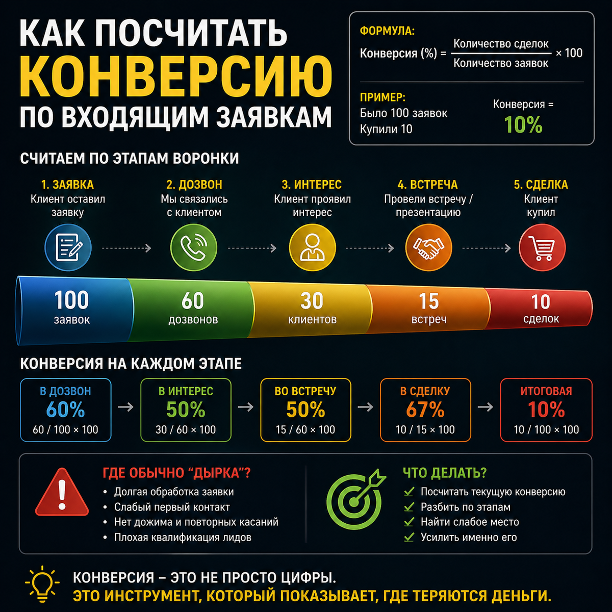 “у нас 10% и всё нормально” Нет. Это как измерять температуру по больнице. Чтобы реально управлять продажами, нужно разбить путь клиента: Пример: И вот здесь начинается магия. Допустим: Получаем: 👉 И теперь ты точно видишь, где проблема. (и например решение: если посмотреть на базу, верификацию контактов и увеличивать дозваниваемость, то и конечный результат сразу изменится в лучшую сторону) Конверсия — это не “метрика для отчёта”. 👉 Это инструмент, который показывает, где лежат твои деньги.
