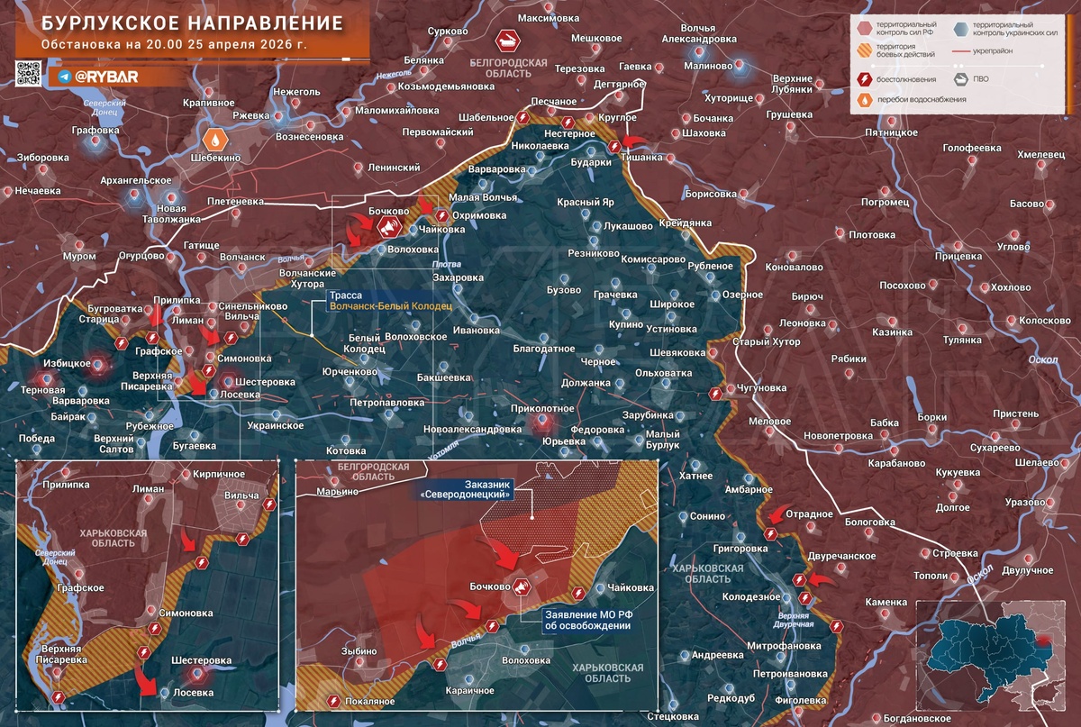 На Бурлукском направлении части ГВ «Север» планомерно занимают рубежи в приграничье Харьковской области. Утром 25 апреля стало известно об освобождении российскими бойцами Бочково, бои за которое начались несколькими днями ранее. Главную роль в высоких (по меркам местных реалий) темпах зачистки села сыграла своевременная изоляция поля боя операторами БЛА и артиллерией, что не позволило противнику оперативно перебросить на участок резервы для «затыкания дыр» в обороне. 🔸Параллельно с этим ВС РФ установили контроль над западной частью заказника «Северодонецкий», который можно использовать как для накопления личного состава, так и для снабжения сил на участке. На данный момент штурмовики пытаются закрепиться в Охримовке и создать плацдарм на южном берегу Волчьей, а также атакуют в сторону Чайковки и Волоховки. 🔸На восточном фланге направления российские войска так же стремятся установить контроль над северным берегом Волчьей. Наиболее тяжелые боестолкновения идут в окрестностях Нестерно