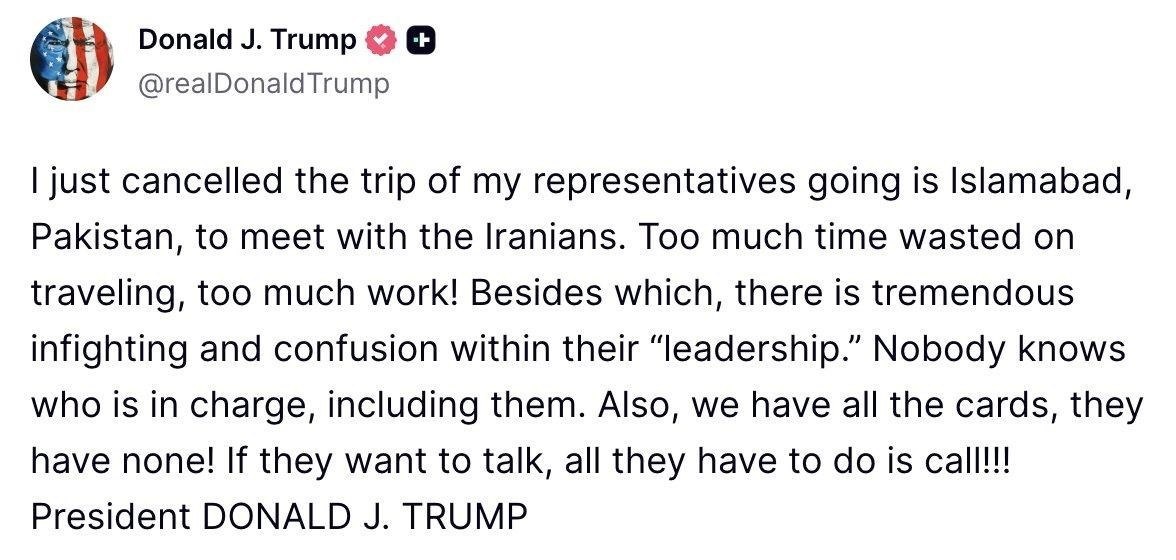 Трамп опубликовал следующий пост: Я только что отменил поездку моих представителей в Исламабад, Пакистан, для встречи с иранцами. Слишком много времени тратится на путешествия, слишком много работы! Кроме того, в их "руководстве" происходят огромные внутренние раздоры и путаница. Никто не знает, кто главный, включая их самих. Кроме того, у нас есть все козыри, а у них нет ни одного! Если они хотят поговорить, все, что им нужно сделать, это позвонить!!! https://dzen.ru/id/6425916a1950720421f18802