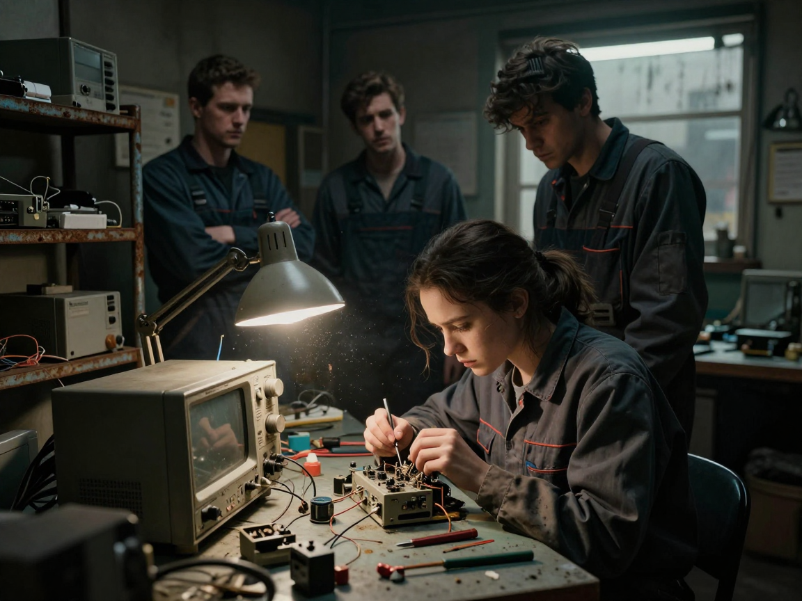 Катю не взяли в мастерскую, но уже через месяц она делала всю сложную работу вместо тех, кого взяли официально, только об этом никто не должен был знать. Мастерская стояла за рынком, в длинном низком здании с мутными окнами, через которые почти не проходил свет. Внутри пахло металлом, старым маслом и пылью. На столах лежали вещи, которые перестали работать, но их ещё не решились выбросить: часы с застрявшими шестернями, радиоприёмники с пропадающим сигналом, миксеры, которые гудели, но не вращались, швейные машинки, где игла начинала уходить в сторону. Здесь не ремонтировали быстро — здесь пытались понять, где именно всё сломалось. Катя пришла с папкой схем и записями, объясняла, что умеет, что готова учиться, но услышала спокойное «мест нет». Она кивнула и не ушла. Через несколько дней она уже стояла в мастерской вечером, когда все уходили. Павел Иванович не прогнал её, просто однажды оставил на столе разобранный будильник. Она собрала его, он заработал, и после этого её перестали зам