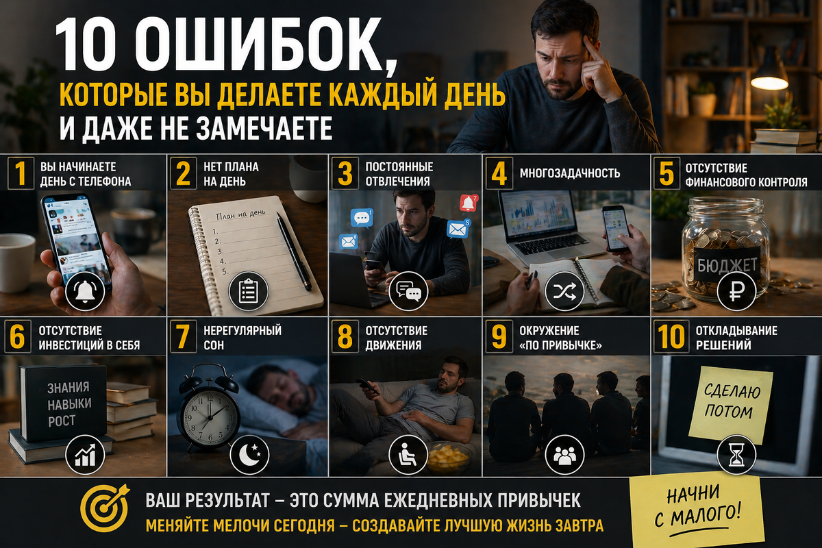 Большинство проблем в жизни возникают не из-за крупных провалов, а из-за мелких действий, которые повторяются ежедневно. Они незаметны, кажутся «нормой», но именно они формируют результат — в деньгах, карьере и качестве жизни.
