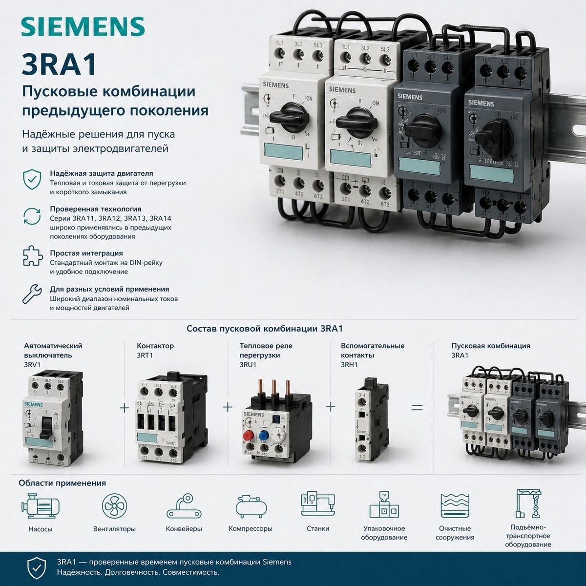 Применяются в задачах: пуск асинхронных двигателей в действующих шкафах, замена и расширение существующих систем. Особенности серии: те же варианты пусковых схем что в 3RA2 (прямой, реверсивный, звезда/треугольник), но с винтовыми клеммами и компонентами серии 3RT1+3RV1. Артикулы серии 3RA1 в наличии и под заказ: • 3RA19543A — Механическая блокировка для 3RT135, 3RT136, 3RT137 • 3RA19542G — Соединитель для YD-комбинации, типоразм. S6-S6-S3 (2 x 3RT1.5, 1 x 3RT2.4) • 3RA19733E — НАБОР ПРОВОДНИКОВ ДЛЯ КОНТАКТОРНОЙ СБОРКИ ЗВЕЗДА-ТРЕУГОЛЬНИК ТИПОРАЗМЕР S12-S12-S10 • 3RA19533G — Набор соединительных шин между контактором для включения треугольником 3RT1.5 и контактор... • 3RA19733D — НАБОР ПРОВОДНИКОВ ДЛЯ РЕВЕРСИВНОЙ КОНТАКТОРНОЙ СБОРКИ ТИПОРАЗМЕР S12 • 3RA19732B — НАБОР ПРОВОДНИКОВ ДЛЯ КОНТАКТОРНОЙ СБОРКИ ЗВЕЗДА-ТРЕУГОЛЬНИК ТИПОРАЗМЕР S12-S12-S12 • 3RA19732A — НАБОР ПРОВОДНИКОВ ДЛЯ РЕВЕРСИВНОГО ПУСКАТЕЛЯ ТИПОРАЗМЕР S12 • 3RA19722F — МОНТАЖНАЯ ПЛАТА ДЛЯ КОНТАКТОРНОЙ СБОРКИ ЗВЕЗДА-ТРЕУГОЛЬ